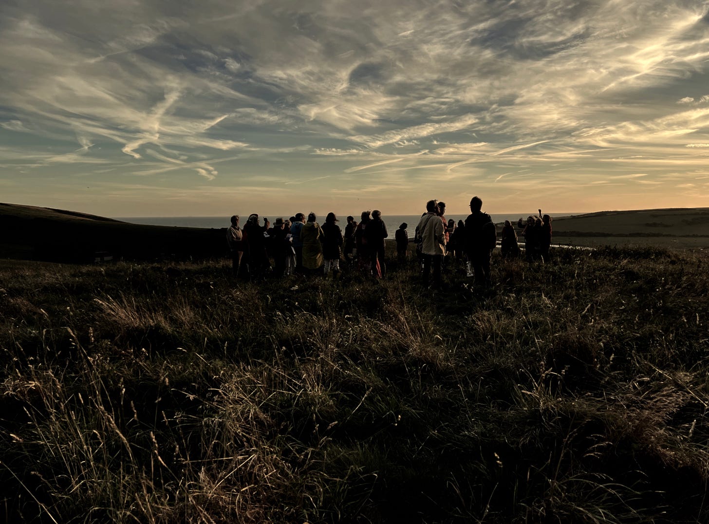 And, since we are on a former sacred site, how about a little more; imagine all those who have ever been here before you, over the millennia. The ancestors from the Middle East, Africa and across Europe, travelling over the land bridge to this island before it split apart from the mainland, escaping environmental disaster, war or persecution. The imprint of so many humans, since and now, creating these desire paths through the landscape, with moments of pause and rest at points like this. Imagine us all, with our tap roots, reaching down into the depths of the estuary channel, connecting and intersecting with the families of hawthorn and other tree roots, and the moist genius of the mycelium networks. Imagine us all becoming more than human in the chalk, the soil and the mix of spring, river and seawater below.